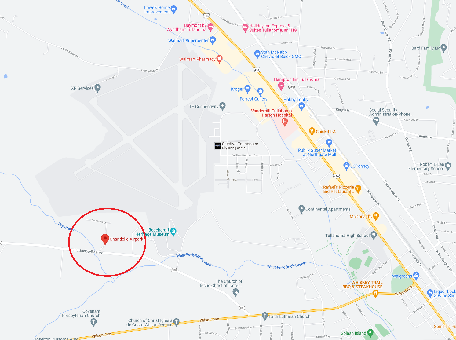 Chandelle Airpark is off of Highway 130 (Old Shelbyville Hwy), on the southwest corrner of Tullahoma Regional Airport (KTHA). Heading out of town, you'll leave the main drag, Jackson St, and head west on Wilson Ave. After about a mile you'll turn right onto Highway 130. We're on the right, just a bit past the entrance to the Beechcraft Heritage Museum.